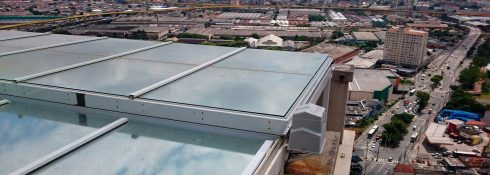 Teto Retrátil motorizado, com vidros laminados 12 mm, película de controle solar e colunas de alumínio reforçado, tamanho da folha móvel 8,00 x 3,00 mts